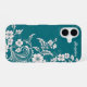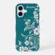 A refined floral illustration in crisp white set against a rich emerald-teal background. This elegant design blends ornamental scrollwork with botanical charm, evoking a feeling of quiet luxury and timeless style.