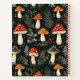 This charming illustration showcases a festive woodland scene with red and brown spotted mushrooms, holly leaves, and vibrant red berries, interspersed with pine branches. The dark background highlights the warm, earthy tones of the mushrooms and the rich greens of the foliage, creating a whimsical yet cosy holiday atmosphere. The playful arrangement evokes a sense of winter magic, blending nature with a seasonal spirit.