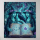 This fantasy poster features two mystical witches with raven and spellbook in a glowing enchanted forest, surrounded by moonlit swirls, runes, and purple magic. Finished in a oil acrylic painterly style.