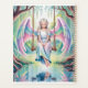A soft pastel digital illustration of an ethereal angel with long flowing white hair and a serene expression, gently seated on a wooden swing. The angel's wings shimmer with an iridescent, pearlescent sheen, reflecting soft pinks, blues, and greens as they gently sway. Below, a tranquil pool of water mirrors her image, surrounded by the roots of two ancient willow trees, their branches gracefully arching overhead. The scene is bathed in a gentle, diffused light, creating a dreamlike atmosphere and sense of peaceful reflection.