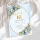 Perfect for elegant, modern, or garden-inspired parties, the harmonious mix of dusty blue, white florals, and greenery creates a timeless look that feels both youthful and upscale. The gold frame adds a subtle touch of glamour, making this design ideal for formal Sweet Sixteen events, evening celebrations, or classy birthday themes. The balanced layout ensures party details are easy to read while maintaining a polished, photo-worthy presentation.