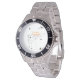 Has heft and feel of expensive stainless steel quartz watches. Good band with safety catch. I removed links, which is easy because engraved arrows show direction to push the linking pins. As always by this seller, the image (a railroad logo) is a perfect reproduction of my emailed image, and is precisely spaced and aligned.