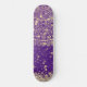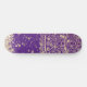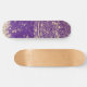 A stylish gold ornate lotus mandala on a purple backdrop with golden stars raining down with glittery gold edging on the bottom of the skateboard creating extra glam. Mystical whimsical vibes.