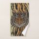 This is an elaborate, decorated face of a tiger on a tiger skin backdrop for contrast. Bold and wild with animal magnetism. Perfect for any tiger themed bathroom. Enchanting and exotic.