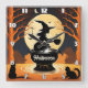 A witch stirs her cauldron beneath a glowing full moon, with silhouettes of flickering bats and curious cats nearby, capturing the essence of Halloween magic.