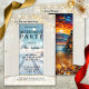 Retirement party invitation featuring an image of opening doors showing a road with sparkling snow flakes. The back shows a boho chic design with a colourful festive landscape scene. Gold stylised stars add to a Christmas atmosphere. Beautiful for a retirement at the end of the year to celebrate what has been accomplished and welcome in a new year with new beginnings in life.