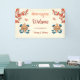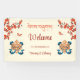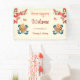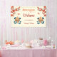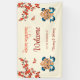 This Tibetan wedding reception board features a traditional yellow gold knot of happiness with blue ribbons, red flowers and butterflies and a wedding welcome text in an elegant script on a modern cream background.