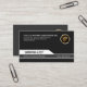 A simple design with the centerpiece at the base of the card being the main object of attention. Your name rest in a white trapezium. Right below is a grey rectangle which houses your job title and further down the line, your contact details. All this in a black elegant background. Directly above you have the business name and address with its faux gold icon logo beside it.