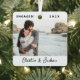 Capture the joy of your first Christmas together with this elegant holiday photo ornament. Featuring 'Merry Christmas' in modern red typography and your names in a chic handwritten script on a crisp white background, this ornament offers a clean and contemporary design that perfectly complements any holiday decor. Easily customise the photo, names, and greeting to create a personal keepsake. The example image shows a happy couple, ready to be replaced with your own cherished memory. Make this holiday season one to remember with a stylish and timeless ornament!