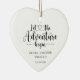 An engagement announcement ornament with the popular phrase: "let the adventure begin". A versatile ornament. A keepsake gift for the couple, OR wedding party proposal gift. Present this gift to friends while asking them to be in the wedding party. But don't forget mum and dad! Surprise them with this keepsake too!