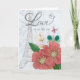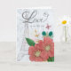 Engagement congratulations card features a bright floral bouquet with butterfly, hand drawn Eiffel Tower, and the words "Love is in the air." Abstract grey background has subtle design elements including leaves, flowers, and other random objects.