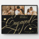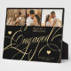 Elegant classic faux gold romantic calligraphy script engaged script couple 3 photo collage, name and engagement date personalised black keepsake plaque.