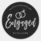 A fun and unique white against black script-lettered sticker explicitly tailored to you for an engagement party. It features the word "engaged" with wedding rings resting over it. Underneath this and above it are the names of the bride and groom and the engagement date.