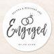 A fun and unique script lettered paper coaster tailored specifically to you an engagement party. It features the word "engaged" with wedding rings resting over it. Underneath this and above it are the names of the bride and groom and the engagement date.