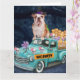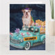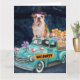 A cute English Bulldog sitting on Halloween truck with skulls is a perfect Halloween gift idea for someone who love dogs.