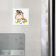 This fun canine magnet features a hand-drawn image of a happy dancing English Bulldog puppy dog highlighted against a creamy white background.