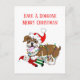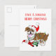 A goofy English Bulldog got his Santa dog toy tangled in Christmas lights. A wonderful holiday postcard for Bulldog fans!
