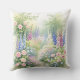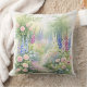 Step into a serene floral sanctuary with this beautiful watercolor secret garden throw pillow. The design features a charming stone path winding through a lush border of blooming pink roses, towering purple foxgloves, and bright blue delphiniums.