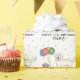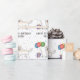 Cute birthday theme design featuring Destei's original cartoon illustration of a cute English cream coat colour Golden Retriever breed dog. The dog has a happy face expression with kind eyes and the dog's pink tongue is showing. Next to the dog there are colourful birthday balloons tied on a dog bone and a purple and yellow colour present box. The background has a playful pattern of colourful pastel confetti on a white background. There is also a personalizable text area.