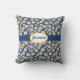 Cute, little, white daisies with bright yellow centres on a blue background creates a simple and sweet throw pillow. Personalise with your name in a yellow-bordered oval held by a dark blue band.