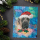 English Mastiff Breed Dog Christmas feature a watercolor of an English Mastiff with a red Santa's Hat, a red Christmas collar, and a galaxy watercolor.