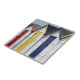 This ceramic tile is decorated with a photo of traditional, wooden, colourful English beach huts. They are painted white, with doors in primary red, yellow, blue and green.