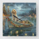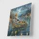 Set sail into the magic of the holiday season with this beautifully detailed illustration, showcasing a proud dog sitting in a festively decorated boat, gliding across a serene Christmas lake. The twinkling lights from nearby pine trees reflect off the water, casting a warm, festive glow that enhances the cosy ambiance. Ornaments dangle from the boat's sides, while glowing lanterns light the way, creating a scene that captures the true essence of Christmas warmth and joy. This nostalgic artwork brings a touch of holiday magic to any space, perfect for those who cherish the spirit of the season.