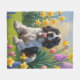 A cheerful dog sits peacefully on lush green grass, surrounded by colourful spring blooms under a soft blue sky. This digital oil painting captures a serene moment with expressive brushstrokes, warm colours, and a sense of gentle joy.