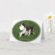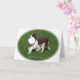This is a blank note card featuring an original photograph of a stunning Liver and White English Springer Spaniel running in the grass with a white frisbee, with the text "English Springer Spaniel".