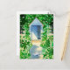 A beautiful watercolour painting of an English Cottage Garden. If you love garden art and the English gardening style, then you will love this sunny picture of a summer's garden in England on this elegant garden art card by English artist, Paul Stickland. A beautiful postcard for a gardening friend or gardener. An open cottage door in England surrounded by flowers and plants, with a garden path leading up to it. An open book lies on the path, surrounded by cottage garden plants. A fine art floral print for a garden lover, a gardener or garden themed summer room.