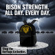 An intricate illustration showcases the head of a bison buffalo, featuring bold lines and detailed textures. The artwork is framed within a circular design, emphasizing the powerful features of the animal, representing strength and nature.