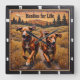 This appealing square wall clock features a dimensional illustration of two reddish-brown dogs running along a path toward the viewer. The entire design is rendered in rich brown, orange, and tan tones, strongly suggesting a deep carved relief or Engraved Wood Look. The dogs are highly detailed, showing texture in their fur, and have happy, open-mouthed expressions. They are surrounded by long, textured brown grass. The background shows stylized pine trees and layered mountain peaks under an orange sky. The small, three-dimensional embossed text "Besties for Life" is carved across the top. The clock face features a simple clock face border with large, white, numbered tick marks (1 to 12) integrated into the outer frame. The artwork is surrounded by a thick, dark brown decorative border that resembles a black wood frame.