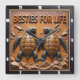 This striking square wall clock features a highly dimensional illustration of two sea turtles side-by-side. The entire design is rendered in deep orange, black, and tan tones, strongly suggesting a carved relief or Engraved Wood Look. The turtles have highly detailed, textured shells in orange and dark gray, and are positioned on a textured sandy ground. The background shows stylized, textured rocks and shell fragments. The large, three-dimensional embossed text "BESTIES FOR LIFE" is carved across the top. The clock face features a simple clock face border with large, white, numbered tick marks (1 to 12) integrated into the frame. The artwork is surrounded by a dark, textured decorative border that resembles a black wood frame.