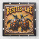 This striking square wall clock features a highly dimensional, vibrant illustration of two sea turtles side-by-side. The entire design is rendered in bright orange, dark brown, and black tones, strongly suggesting a carved relief or Engraved Wood Look. The turtles have highly detailed, textured shells in orange and black, and are positioned on a textured tan sand backdrop. They are surrounded by a raised border of stylized, brown sand dunes. The large, three-dimensional embossed text "BESTIES FOR LIFE" is carved across the top. The clock face features a simple clock face border with large, white, numbered tick marks (1 to 12). The artwork is surrounded by a dark, textured decorative border that resembles a black wood frame.