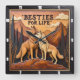This square wall clock features a highly detailed, dimensional illustration of two wolves standing side-by-side in an affectionate pose on a dark rock. The entire design is rendered in vibrant orange, tan, and dark brown tones, strongly suggesting an Engraved Wood Look or carved relief. The wolves are rendered with detailed texture emphasizing their fur, set against sharp, dark pine trees and layered mountain peaks. The sky is a textured orange-brown color. The large, three-dimensional embossed text "BESTIES FOR LIFE" is carved across the upper sky area. The clock face features a simple clock face border with large, white, numbered tick marks (1 to 12) integrated into the decorative frame. The artwork is surrounded by a dark, textured decorative border that resembles a black wood frame.