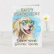 Cute and modern happy retirement card with a funny golden retriever on a tropical beach. Original design created from one of our hand painted watercolors.