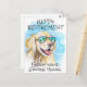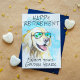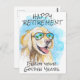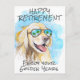 Cute and modern happy retirement card with a funny golden retriever on a tropical beach. Original design created from one of our hand painted watercolors.