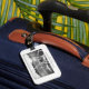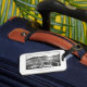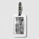 Luggage Tag with a black and white image of a fishing boat entering Cape Town harbour from Table Bay with the view of Table Mountain.