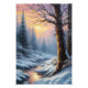 Immerse yourself in the serene embrace of nature's hush. A symphony of warm hues graces the sky as the sun bids adieu, casting a golden glow upon the frozen forest. Ancient snow-draped sentinels stand in quiet reverence, while a gentle mist dances along the horizon. A tranquil stream meanders through, its waters a mirror to this ethereal scene. A masterpiece of classic oil-painting digital art capturing the frozen beauty of a forest at sunset.
