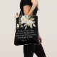 Tote bag with Christian inspirational quote scripture depicts a beautiful watercolor floral with simple white flowers and greenery on a black background. It features a powerful Bible Verse from Ephesians 2:8, "By Grace you have been saved, through Faith, this is not from yourselves, it is the Gift of God"