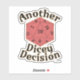 A fun another dicey decision board gaming slogan epic dice rolling dragon fantasy boardgamer tabletop game motto d-6 high roller funny boardgame humour first player hanging out with friends strategy or party game night design unique fun board gaming statement sticker decal. Get a fun board gamer attitude sticker today.