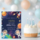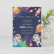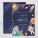 This Epic Space Birthday Invitation features a mesmerizing outer space background with smiling cartoon astronauts, colorful planets, rocket ships, glowing comets, and confetti — all set against a deep navy blue and cosmic purple sky in a soft 3D / watercolor illustration style.