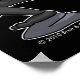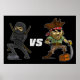Black poster with a face off between pirates and ninjas. There is a black cartoon ninja who has two brown katanas in sheaths, crossing his arms and is standing on a rock. There is also a cartoon pirate who has a grey cutlass, an eye patch, a peg leg, a hook, a tattoo that says mum, a brown hat, a boot, a green button up shirt, khaki pants, a red with white spots bandanna, a belt with gold buckle, and earrings standing on a treasure chest.