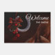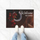 A welcome doormat with a photo featuring a hanging horseshoe adorned with a buffalo plaid ribbon and Christmas decorations.