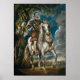 The Duke is shown mounted on a white horse, wearing partial armour and holding a general’s staff, symbolising his military authority. The scallop shell of the Knights of Saint James is visible at his neck, emphasizing his noble status. The painting features a dramatic cavalry battle in the background, reinforcing the Duke’s role as chief of the Spanish armies.