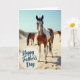 This design shows a striking horse with a rich brown-and-white dappled coat standing alert in the foreground, its steady gaze feeling like a quiet, protective nod from a dad 👨. Behind it, two softer, slightly blurred horses graze close together, their calm proximity suggesting an easy bond like old friends sharing the same space. The setting stretches across sunlit sand dunes with a pale, hazy ocean line in the distance under a clear sky. Light falls from above and to one side, laying longer, gentle shadows that follow the curves of the dunes and give the scene a relaxed, open-air mood. Small tufts of dry dune grass dot the golden sand, adding texture and a natural rhythm to the landscape. In the lower-left corner, a circular badge holds the words “Happy Father’s Day” in flowing dark lettering against a light background, standing out without overpowering the artwork. A few scattered hoofprints trail across the sand toward the midground, hinting at recent movement like a shared walk 🚗. The horse’s mane catches the light in fine strands, and the shoreline fades into a soft bluish-gray band along the horizon.