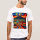 A vivid and colorful depiction of a volcanic eruption dominates the scene with a swirling starlit sky and stylized lava flows. In the foreground, a sinuous river meanders through a landscape dotted with rounded trees and rolling hills, while a dynamic sky swirls above in bold patterns