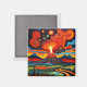 A vivid and colorful depiction of a volcanic eruption dominates the scene with a swirling starlit sky and stylized lava flows. In the foreground, a sinuous river meanders through a landscape dotted with rounded trees and rolling hills, while a dynamic sky swirls above in bold patterns