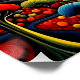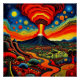 A vivid and colorful depiction of a volcanic eruption dominates the scene with a swirling starlit sky and stylized lava flows. In the foreground, a sinuous river meanders through a landscape dotted with rounded trees and rolling hills, while a dynamic sky swirls above in bold patterns