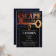 This custom party invitation features a mystery escape room theme. The background is a blue coloured computer binary code pattern on black. A large copper key is printed across the centre with a keyhole lock below it.